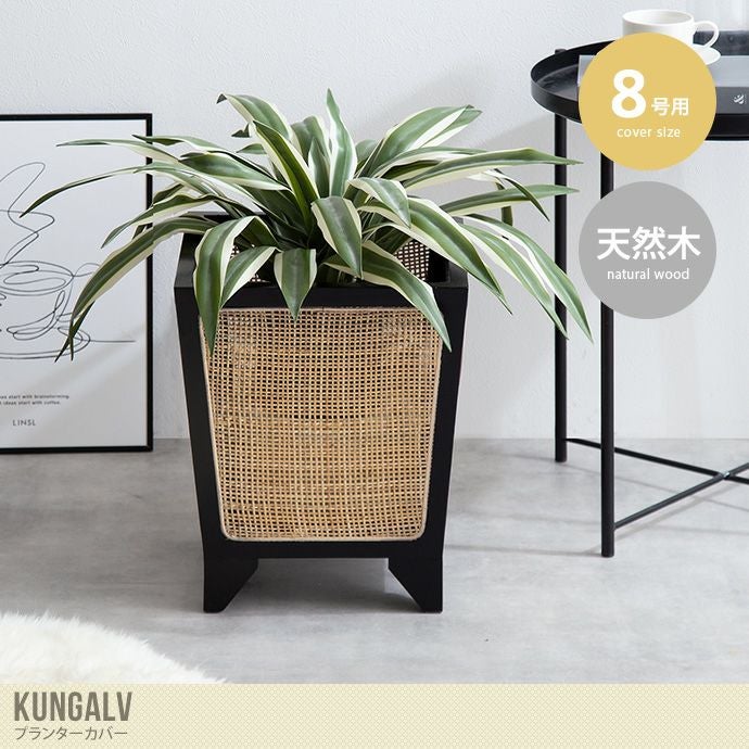 天然木をブラック塗装し、ラタンと組み合わせた落ち着きのあるおしゃれなプランターカバー。脚付きなので鉢底に通気性を確保し、空間に抜け感を与えます。モダンな雰囲気のデザインは和洋室を問わず幅広いテイストに馴染みます。