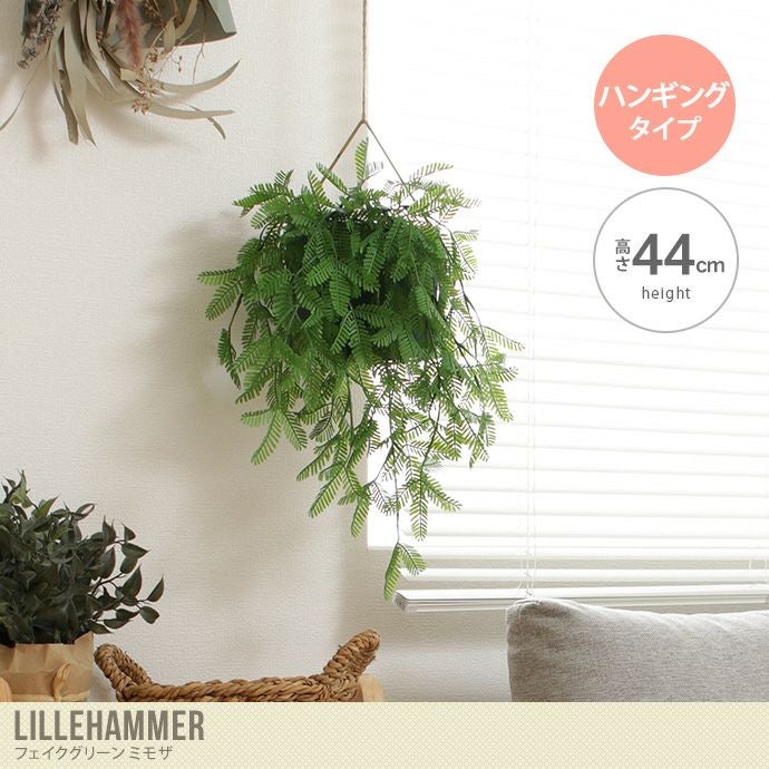 掛けるだけで簡単に飾れるハンギングタイプのフェイクグリーン『Lillehammer(リレンハメル)』シリーズのミモザ。グリーンは癒しの効果があり、どんなインテリアにも馴染みやすくなっています。面倒な水やりや剪定が不要なので、手軽に取り入れやすく初めての方にもおすすめです。