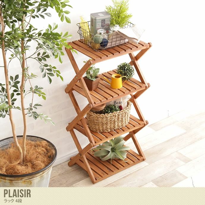 お部屋でもお庭でも、大活躍間違いなしの『Plaisir ラック 4段』。衝撃力や曲げに強く、耐久性に優れ、腐りにくいといった特徴を持つアカシア材を使用しております。天然素材を使用しているので、ナチュラルでかわいらしい雰囲気を演出できますよ♪カントリー調を活かして植物を飾ったり、北欧風にヴィンテージ小物を置いてみたりと、使い方は無限大。流行りの“見せる収納”を楽しんじゃいましょう☆