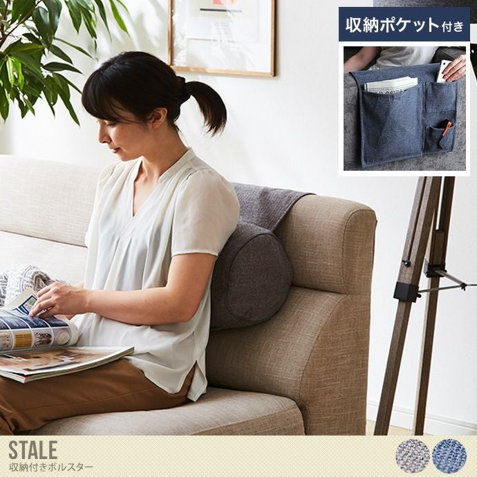 ソファでの生活をより良くする『Stale(ステイル)』収納付きボルスター。背もたれとしてご使用いただけるほか、ソファサイドで枕としても大活躍。クッションの反対側にはスマホやリモコンなどを入れるのに便利なポケット付き。シンプルなデザインとカラーはお部屋の雰囲気を崩しにくく使いやすいデザインです。国内綿入れ加工のため、安心してご使用いただけます。