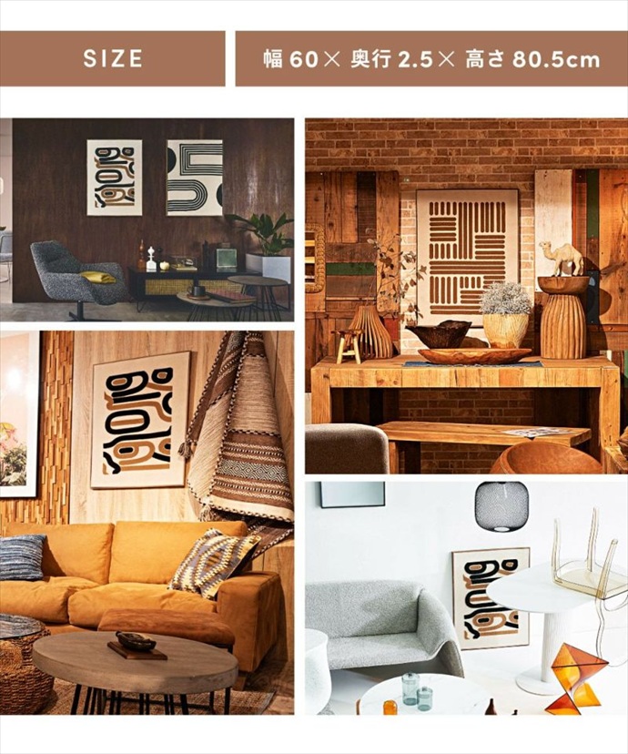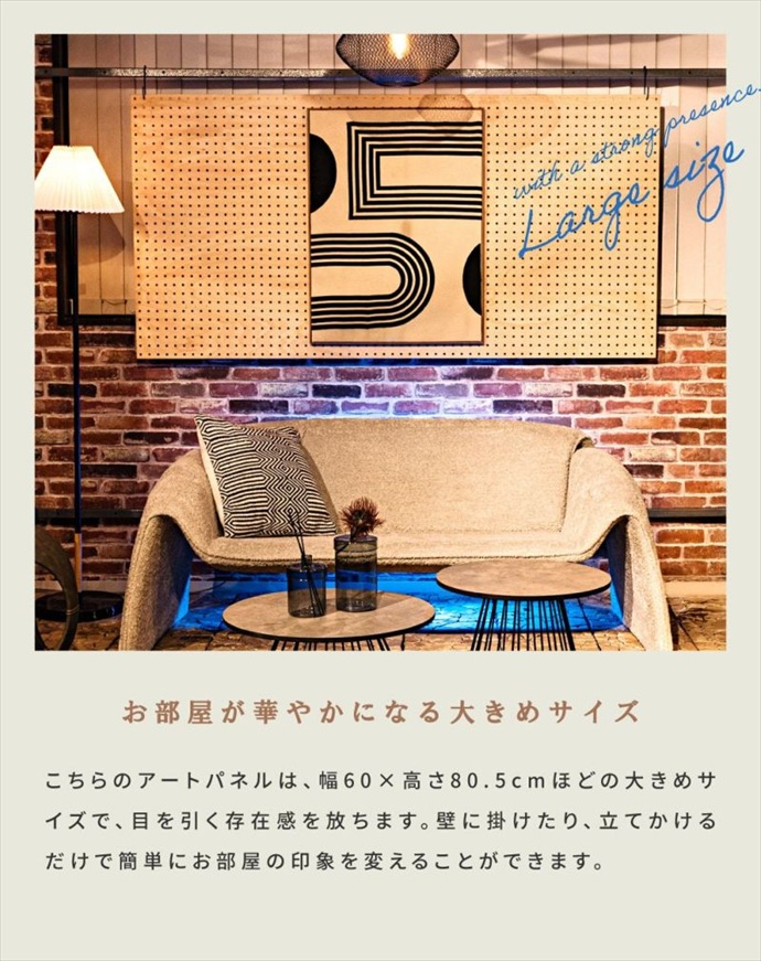 60×80.5cmの大きめサイズで、空間を華やかに彩るアートパネル。モダンな幾何学模様を凹凸のある表現で仕上げ、シンプルなお部屋にも自然に馴染みながら、目を惹くアクセントに。立体的な模様は光が当たることで陰影が生まれ、平面のアートにはない奥行きのある表情を楽しめるのも魅力です。壁に掛けるのはもちろん、床や棚に立てかけるだけでも空間をセンスアップしてくれます。