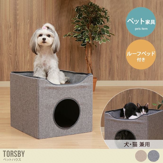 シンプルなデザインのルーフ付きペットハウス『Torsby(トーシュビュー)』。やわらかい手触りのクッションが付いており、フローリング等の床への負担を軽減してくれるので安心です。下はハウス、上はルーフベッドになっているので、1つで2通りの使い方を楽しんでいただけます。カラーはベージュとグレーの2色をご用意しましたのでお好みでお選びください。