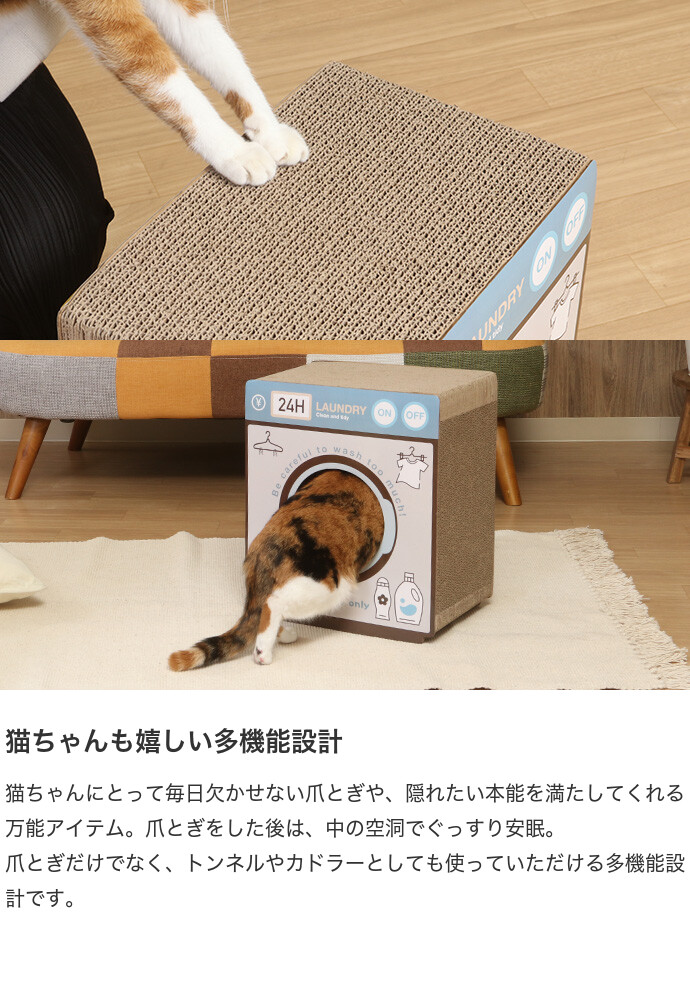 『Pomer(ポメル)』シリーズから猫の爪とぎのランドリー型が登場しました。嬉しい2個セット。表と裏で色違いのデザインなので、気分に合わせてお好きな方向でデザインを楽しめます。段ボールでできた爪とぎは、高密度で強度に優れており、猫ちゃんもバリバリとしっかり爪を研ぐことができます。爪を研いだ後は、中の空洞でぐっすり安眠。この商品の一番の魅力である、カラフルでユニークな形の爪とぎで、愛猫ちゃんの写真撮影を楽しむことができます。