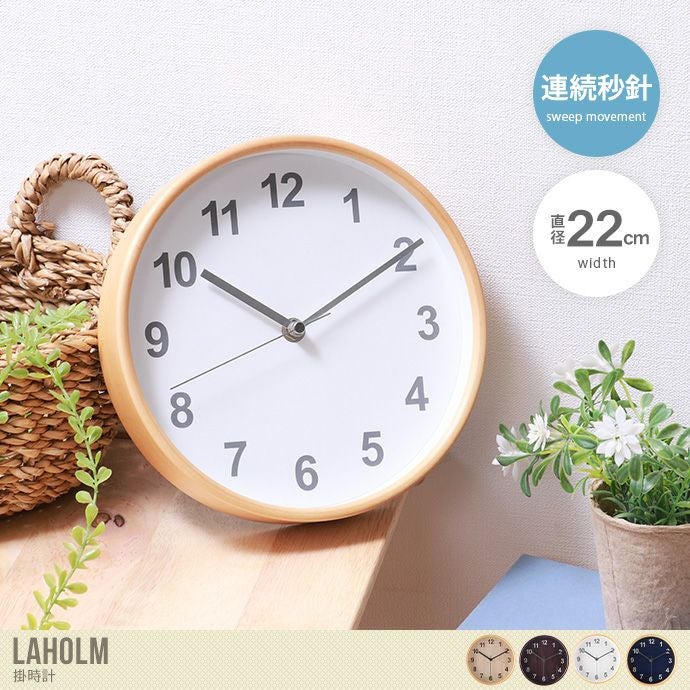 秒針が滑らかに動く連続秒針を採用した掛時計『Laholm(ラホルム)』。秒針のカチカチという音を軽減してくれるので、書斎や寝室などにおすすめです。フレームには天然木を使用し、文字盤は雰囲気の違う4つのカラーをご用意しました。どのカラーも様々なお部屋にマッチするデザインです。