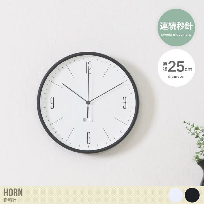 モノトーンカラーでどんなインテリアにも馴染む掛時計『Horn(ホーン)』。文字を最小限にデザインし細身で見やすいフォントを採用しました。文字盤表面はガラスで覆われており、ホコリの侵入を防ぐと同時に、高級感を演出してくれます。