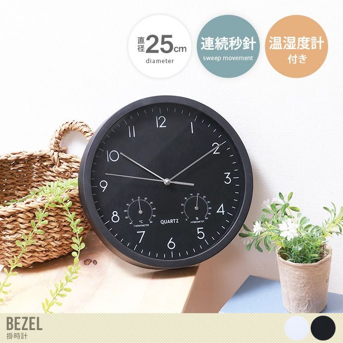 モノトーンカラーでどんなインテリアにも馴染む掛時計『Bezel(ベゼル)』。無駄な装飾をなくしシンプルな文字盤で、遠くからでもわかりやすいフォントを使用しました。温湿度計がついているので、時間だけでなく温度と湿度が一目でわかります。