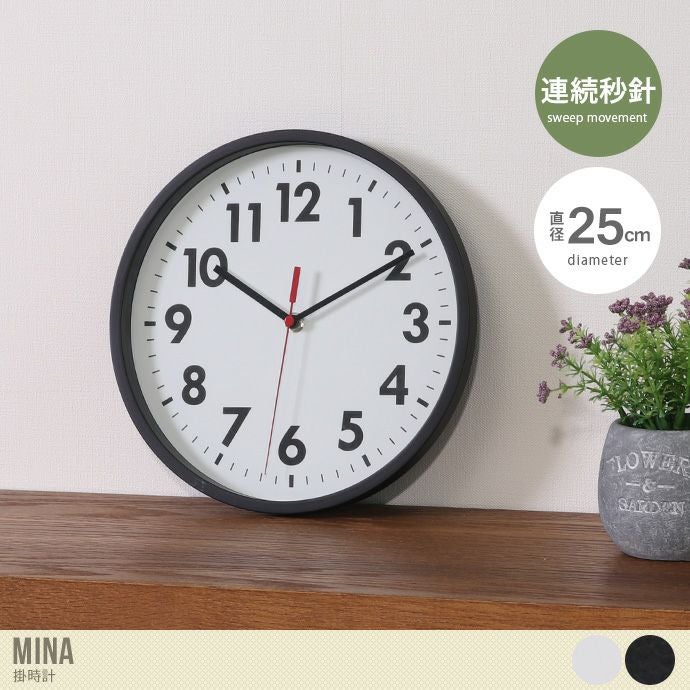 北欧カラーのシンプル掛時計『Mina(ミーナ)』。直径25.4cmとコンパクトながら、見やすい大きめのフォントにモノトーンのシンプルなデザインで、どんなテイストのお部屋にも馴染みます。秒針はカチカチと音がならない「スイープ式」を採用。リビングだけでなく、寝室や書斎など静かな場所にも適しております。