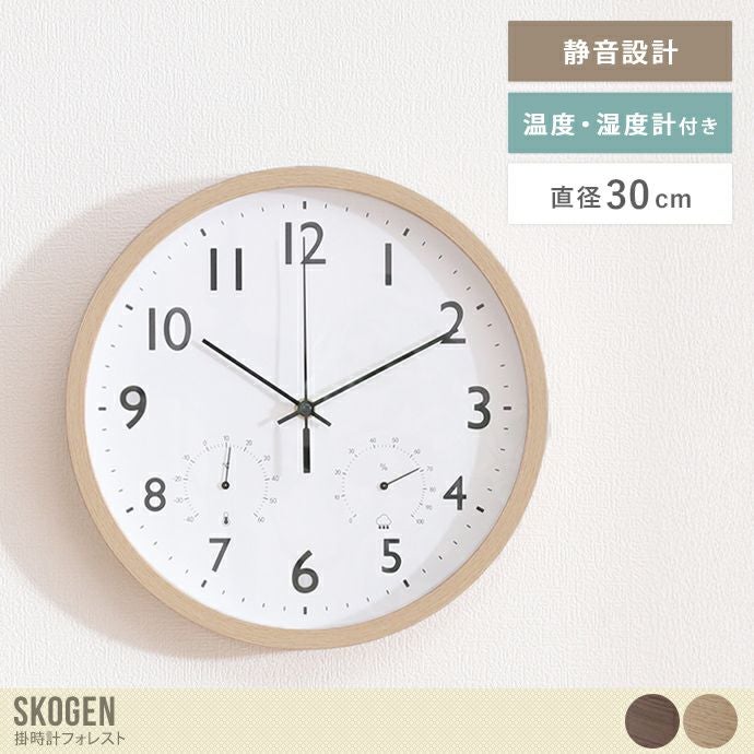 自然のぬくもりを感じる木目フレームが、どんな空間にも優しくなじむ『Skogen(スコーゲン)』掛時計。シンプルで見やすい文字盤と、温湿度計付きの多機能性が、暮らしを快適に彩ります。無駄のない上質なデザインは、ナチュラルや北欧テイストなど様々なテイストのお部屋と相性抜群です。さらに温度・湿度が一目でわかる温湿度計付き。室内の温度と湿度を手軽に確認できるため、快適な環境作りに役立ちます。