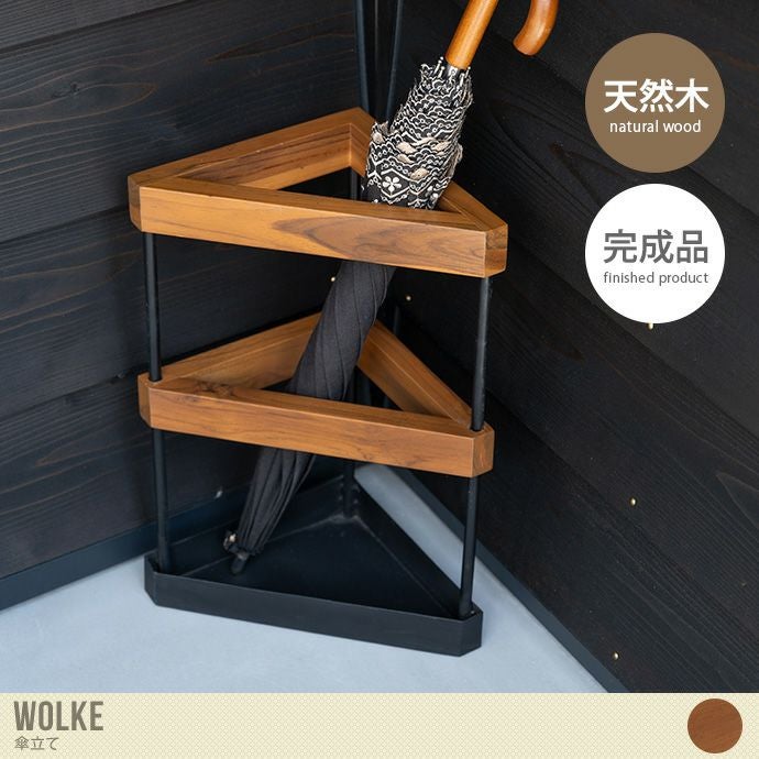 天然木×アイアンの組み合わせが目を引く『Wolke(ヴォルケ)』の傘立て。スタイリッシュな三角形のデザインです。天然木の部分には、耐水性・防腐性に優れているチーク材を使用。木目が非常に美しく、色味も綺麗なので上品な雰囲気を作り出してくれます。スリム設計なので狭くなりがちな玄関でも、場所をとることなく使用が可能です。