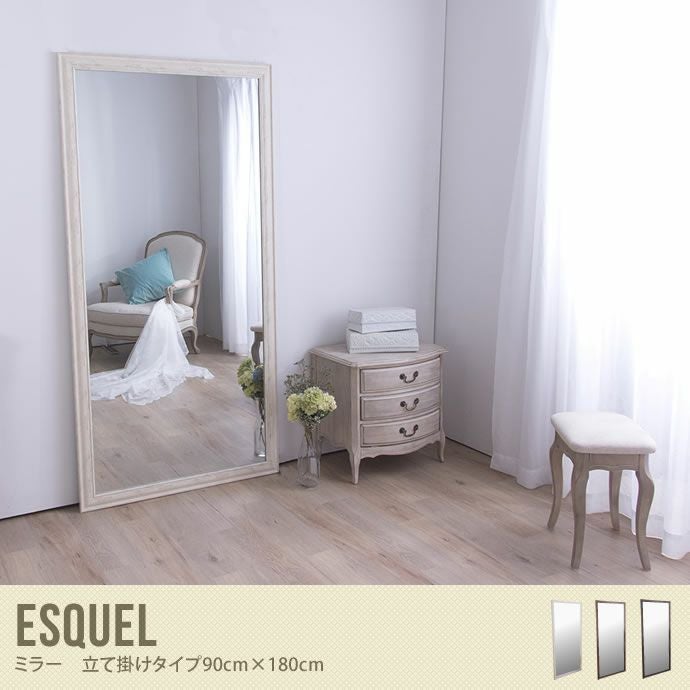 【送料無料】Esquel ミラー 立て掛けタイプ90×180 姿見 大型ミラー アンティーク風 木目 全身鏡 アイボリー
