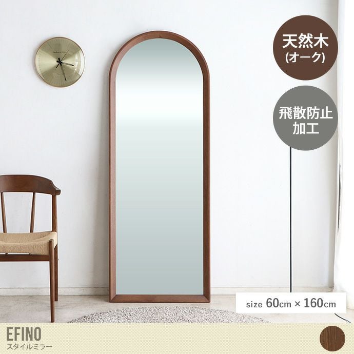 天然木(オーク)のフレームを使用した『Efino(エフィーノ)』のスタイルミラー。高さ160cmとしっかり高さがありながら幅は60cmとスリムなので、お部屋の空いたスペースに置いていただけます。また、アーチ型にすることで鏡を置いた時の圧迫感を少なくしました。フレームは細くすることで足元まで見やすい仕様に、身支度を快適にしていただけます。耐水性が高く防カビ効果があるので玄関先や洗面所など場所を問わずお使いいただけます。