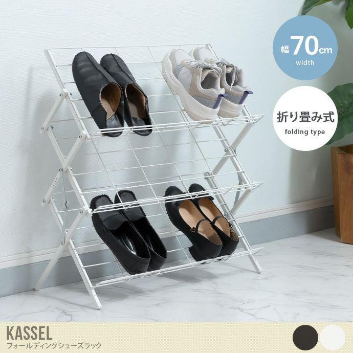 スチール素材で通気性も良く、見た目もサイズもスッキリとしたデザインの『Kassel(カッセル)』のフォールディングシューズラック。かかと部分にはストッパーを設置しました。靴を置いても滑りにくく、きれいに揃えることができるのでスッキリと収納していただけます。