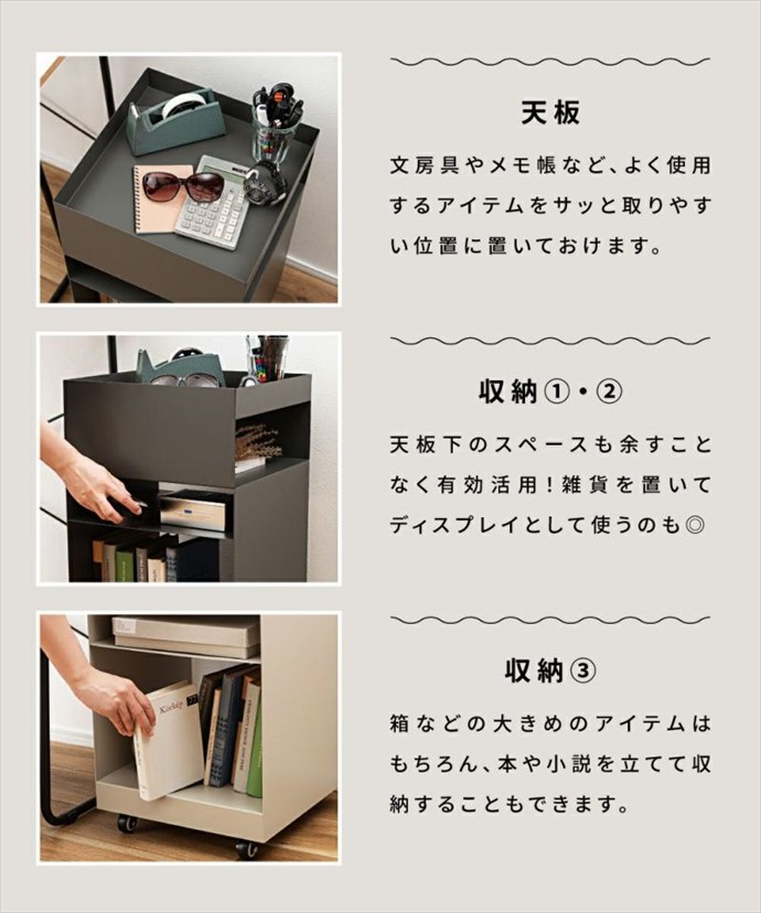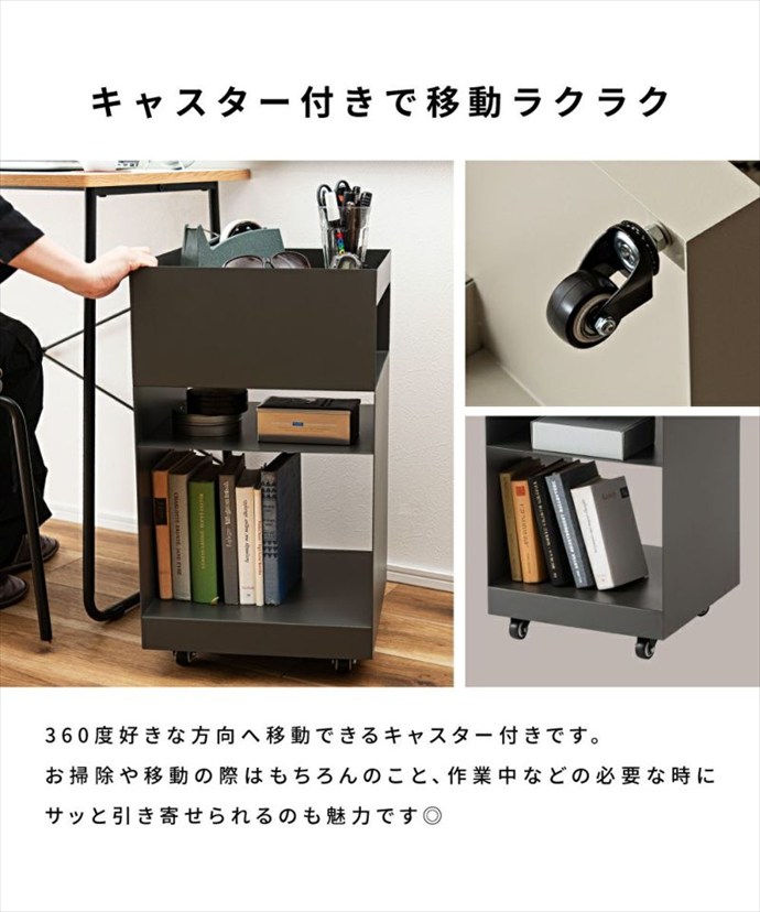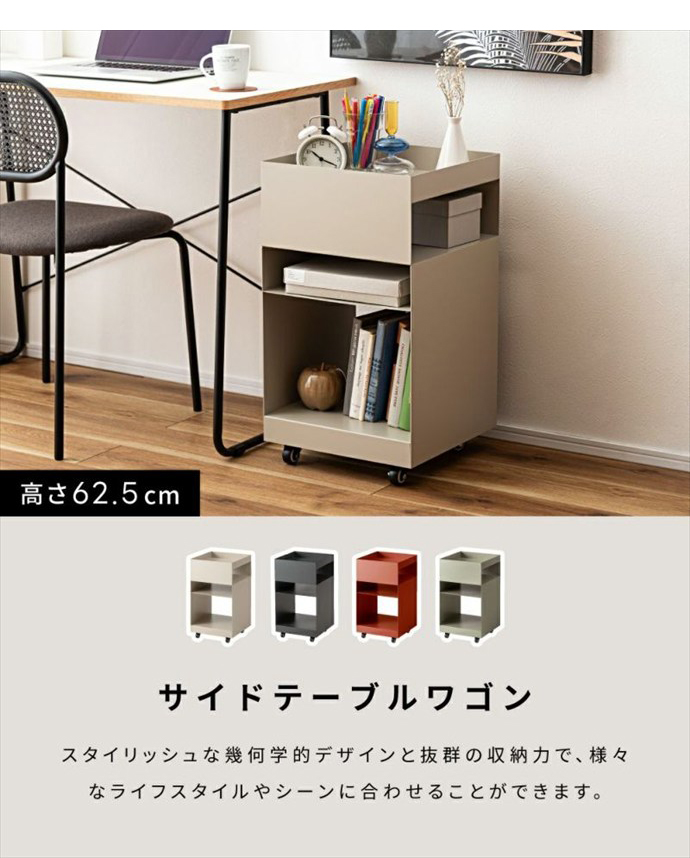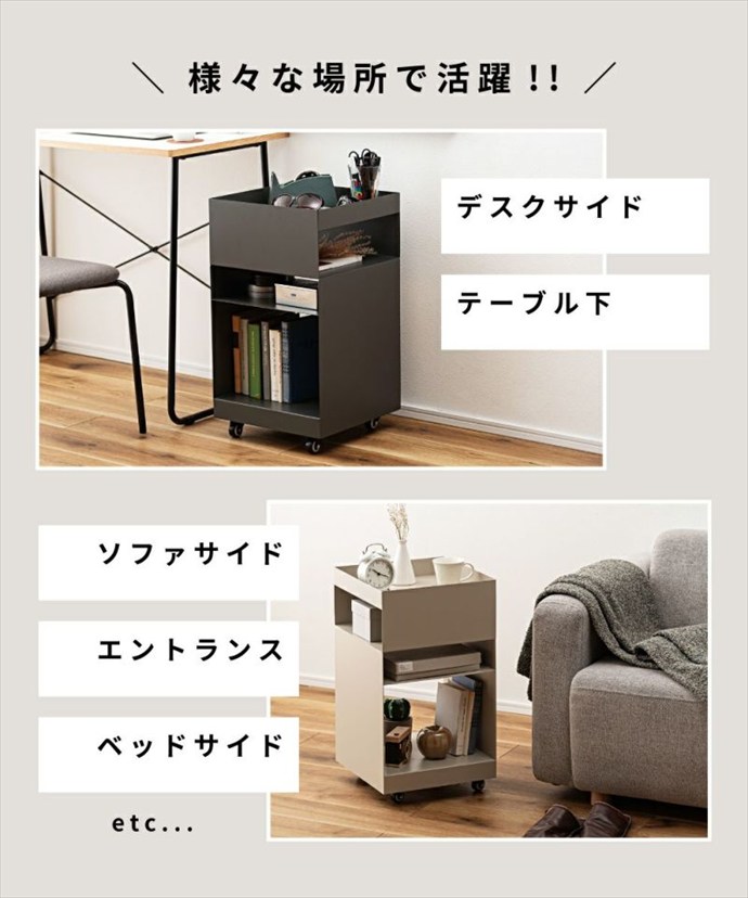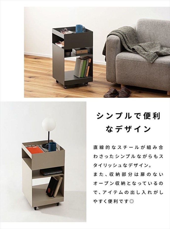 使い勝手抜群の『Recto(レクト)』サイドテーブルワゴン。十分な収納力で、リモコンや雑誌、日用品などをまとめて置くことができ、サイドテーブルや収納ワゴンとして幅広くご活用いただけます。また天板部分には囲いが付いており、飲み物や小物を落とす心配もありません。さらにキャスター付きで移動もスムーズにできるため、リビングや寝室、デスクサイドやキッチンなど様々なシーンでご使用いただけます。