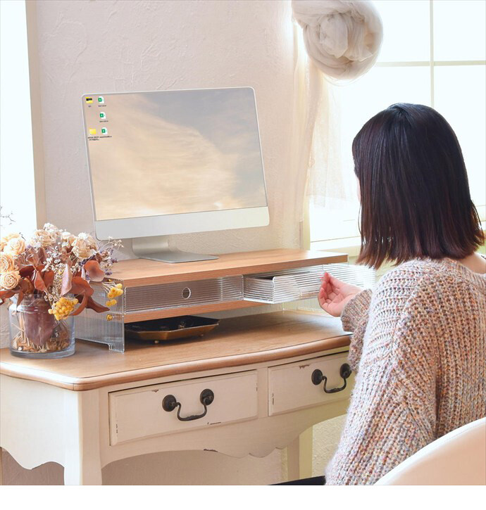 低めで広々としたサイズ感が魅力の卓上収納棚。モニター台として使えばデスク周りをすっきり整理でき、作業スペースを有効活用。キッチンではトースターやケトル置きとしても活躍し、限られたスペースを有効に使える設計です。さらに引き出しが2杯付いており、カトラリーや文具、小物類もすっきり収納。下段スペースも活用できるため、デスク上やキッチンなど様々なシーンで対応する実用性の高い一台です。