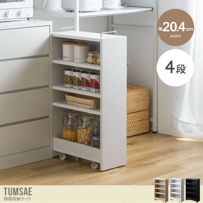 デッドスペースを有効活用できる『Tumsae(トゥムセ)』幅20.4cm隙間収納ラック。ランドリーやキッチン周りでできる僅かな隙間にぴったりフィットし、見た目もすっきりと使いやすいスペースに。様々な場所で大活躍できるよう3つの幅をご用意しているので、使いたい場所に合わせてお選びただけます。隠しキャスター付きで、収納スペースは左右の向きを選べるので、どんな間取りでもお使いいただくことが可能です。