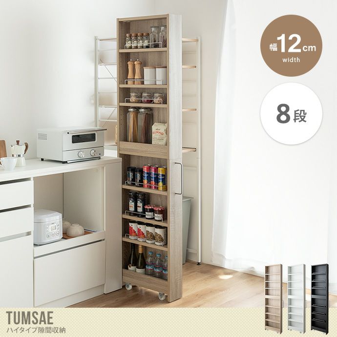 デッドスペースを有効活用できる『Tumsae(トゥムセ)』ハイタイプ隙間収納ラック。ランドリーやキッチン周りでできる僅かな隙間にぴったりフィットし、見た目もすっきりと使いやすい収納スペースに。様々な場所で大活躍できるよう2つの高さとそれぞれ3つの幅をご用意。使いたい場所に合わせてお選びただけます。隠しキャスター付きで、収納部分は左右どちらの向きにも対応するため、どんな間取りでもお使いいただくことが可能です。