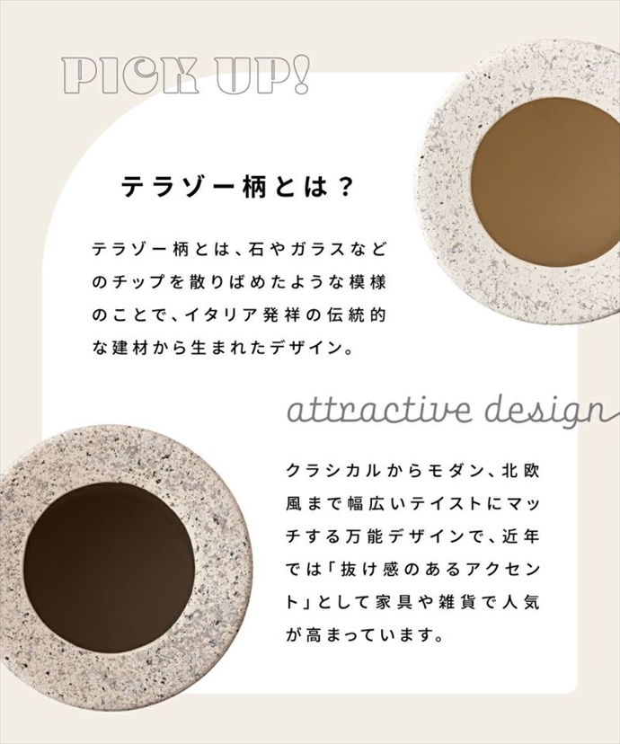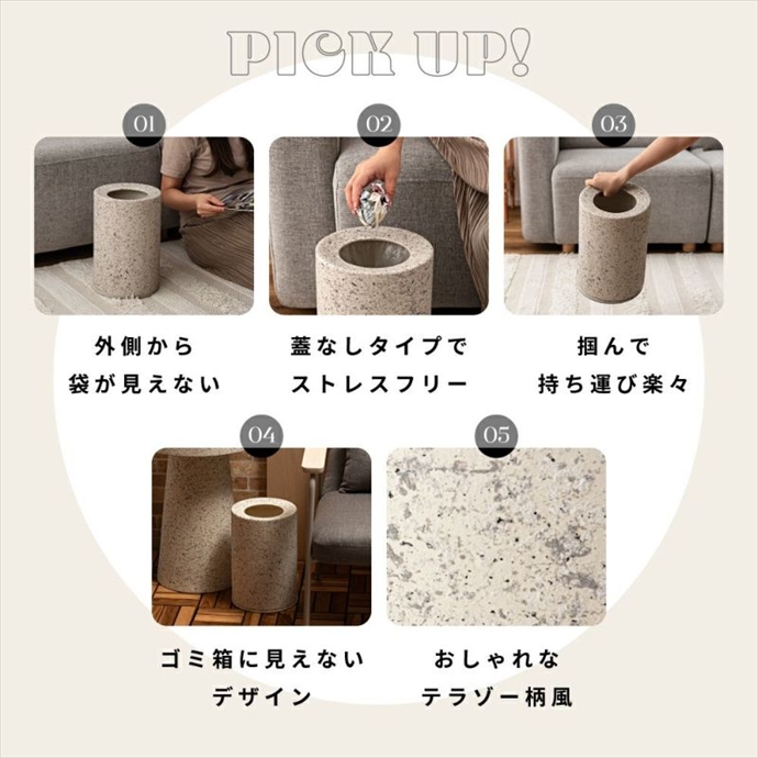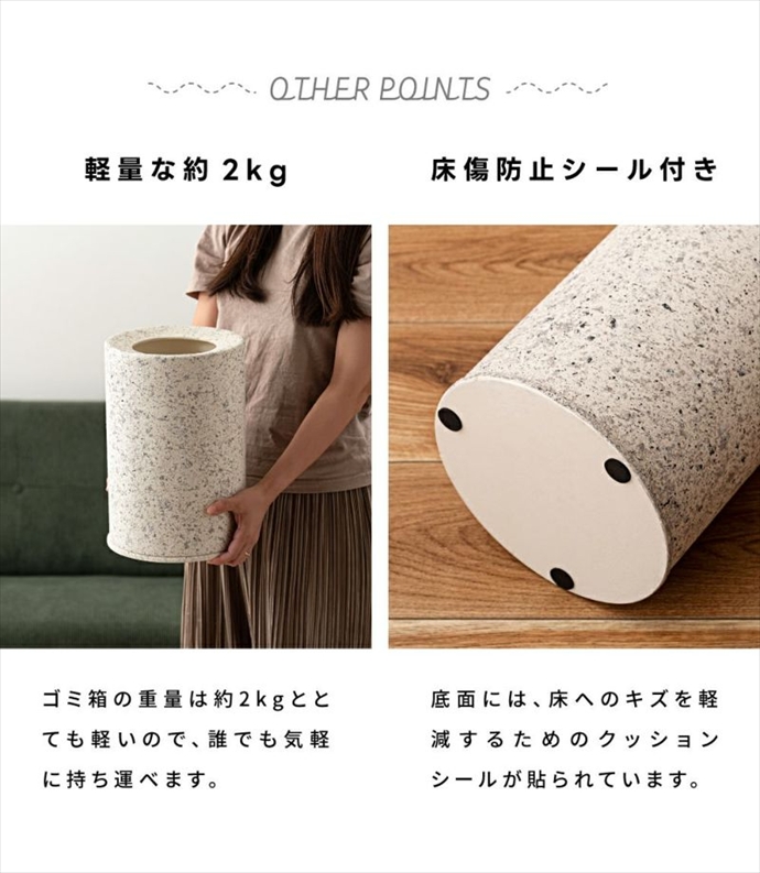 石を散りばめたような美しい柄がまるでオブジェのようなデザインの『Myrtle(マートル)』ゴミ箱。ナチュラルで落ち着いたテラゾー柄風のデザインが、空間にさりげないアクセントを与え、置くだけで上質な雰囲気に。二重構造でゴミ袋が見えないため、生活感を抑えて設置可能です。さらにスリム設計で、ソファサイドやダイニング、洗面所など、お部屋のちょっとした隙間にもすっきり収まり、空間を邪魔せず快適にお使いいただけます。