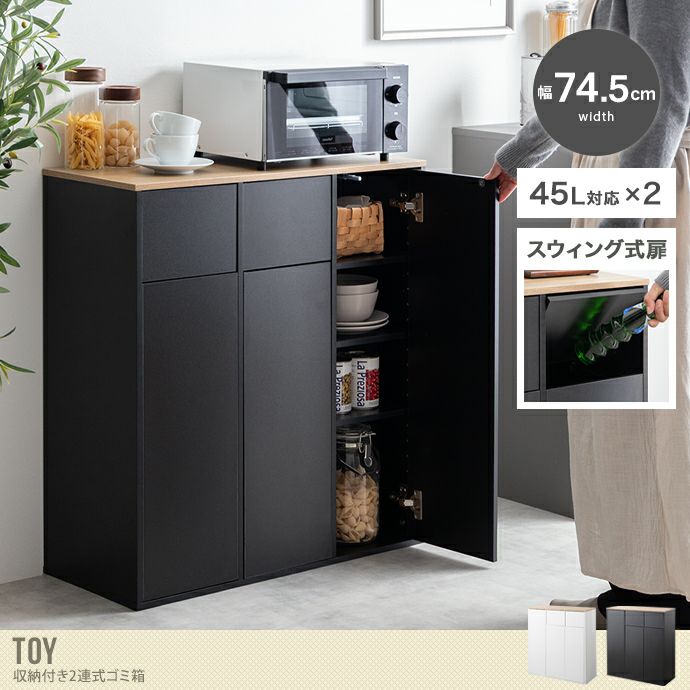 【送料無料】Toy トイ 幅74.5 ゴミ箱 分別 2連式ゴミ箱 収納付き ダストボックス ごみ 縦型 ふた付 フタ 蓋 キッチンカウンター お洒落 シンプル リビング インテリア 45l リットル 木目 モダン ウッド スウィング扉 ホワイト