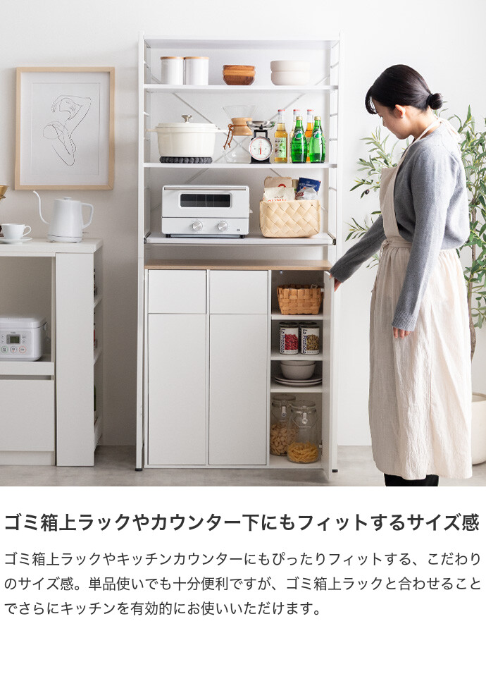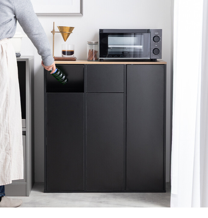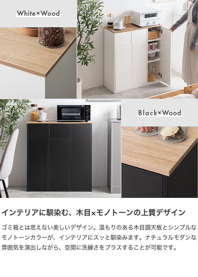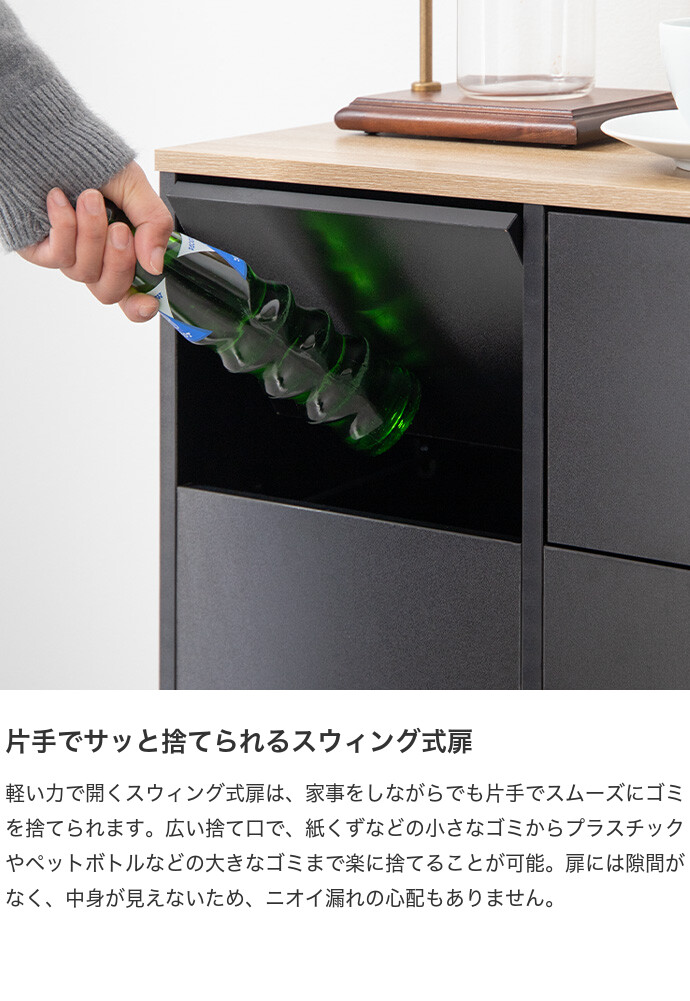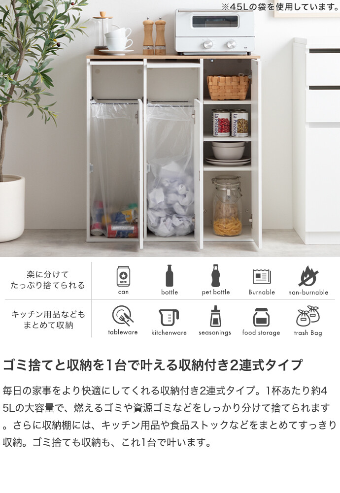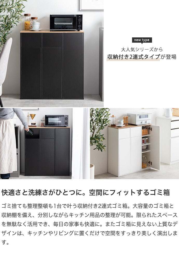 ゴミ捨ても整理整頓も1台で叶う収納付き2連式ゴミ箱。大容量のゴミ箱と収納棚を備え、分別しながらキッチン用品の整理が可能。限られたスペースを無駄なく活用でき、毎日の家事も快適に。またゴミ箱に見えない上質なデザインは、キッチンやリビングに置くだけで空間をすっきり美しく演出します。ゴミ箱上ラックやカウンター下にも収まりやすいサイズ感で、効率的に活用できるのも魅力です。