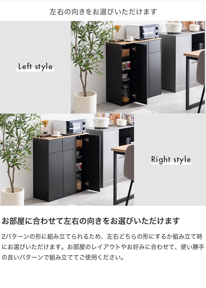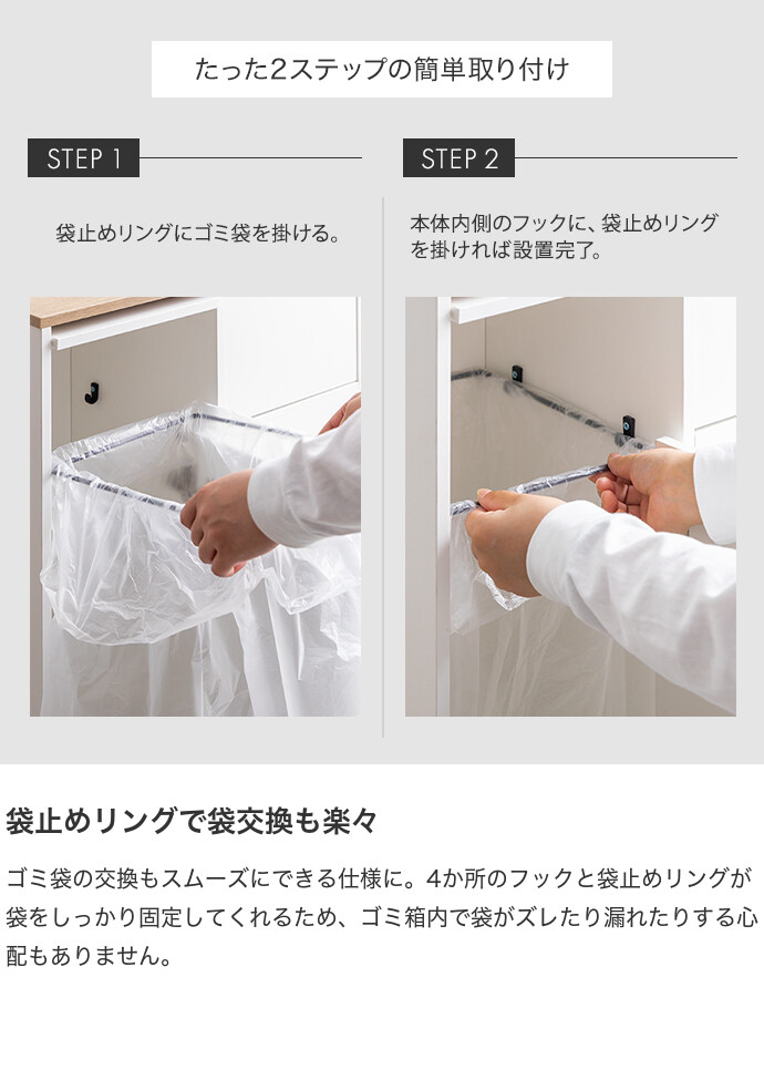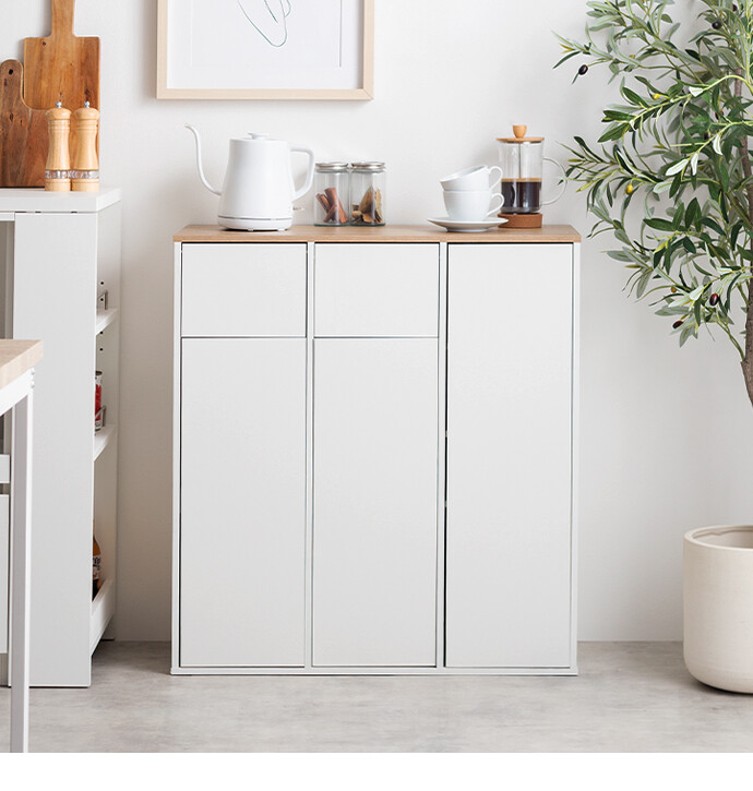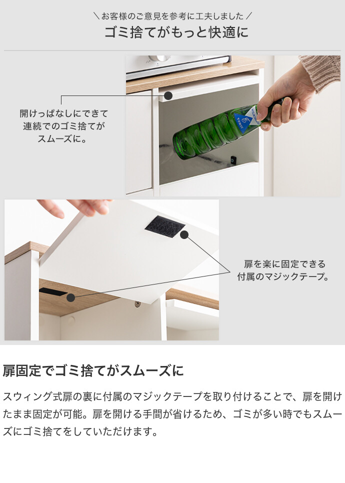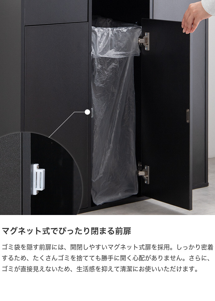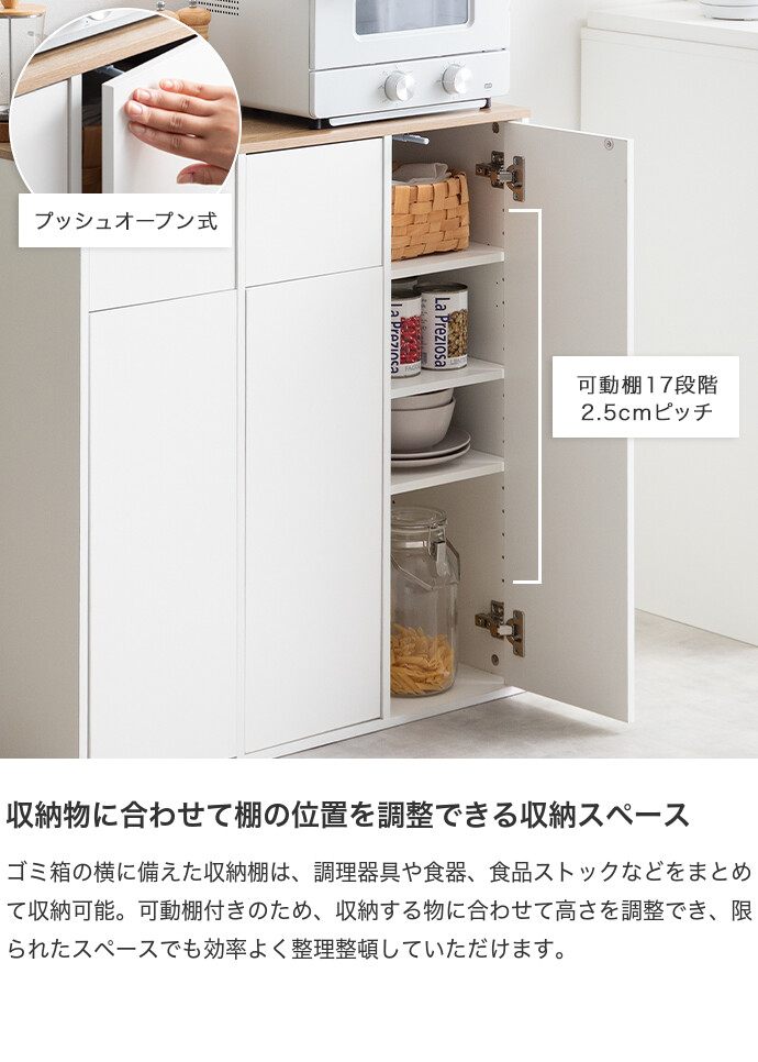 ゴミ捨ても整理整頓も1台で叶う収納付き2連式ゴミ箱。大容量のゴミ箱と収納棚を備え、分別しながらキッチン用品の整理が可能。限られたスペースを無駄なく活用でき、毎日の家事も快適に。またゴミ箱に見えない上質なデザインは、キッチンやリビングに置くだけで空間をすっきり美しく演出します。ゴミ箱上ラックやカウンター下にも収まりやすいサイズ感で、効率的に活用できるのも魅力です。