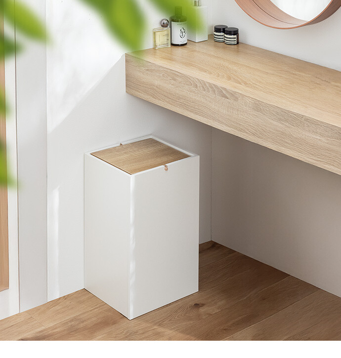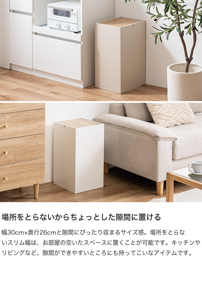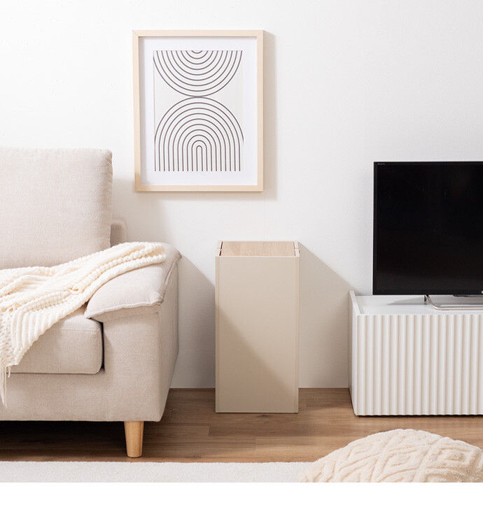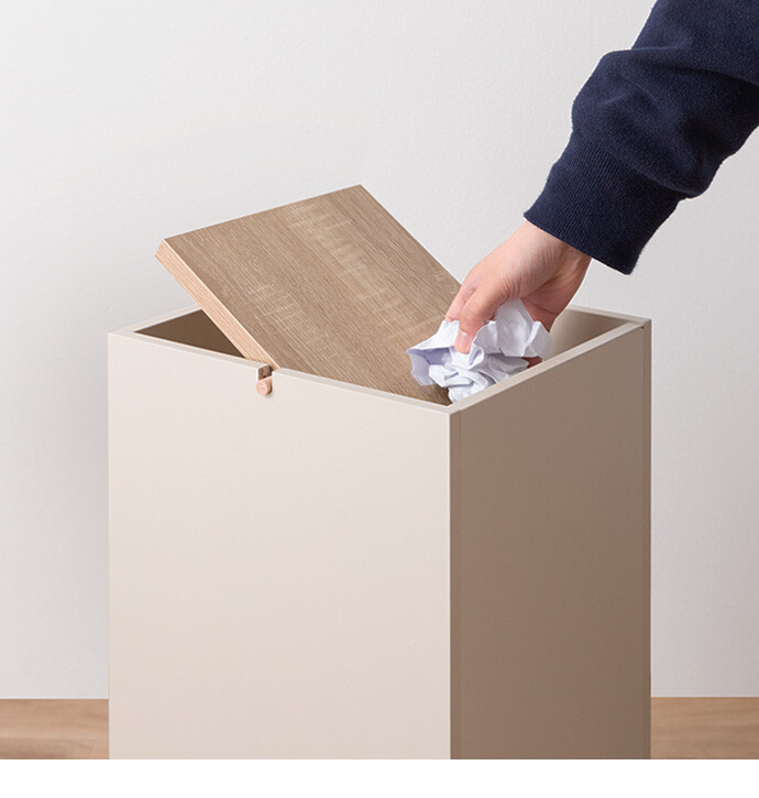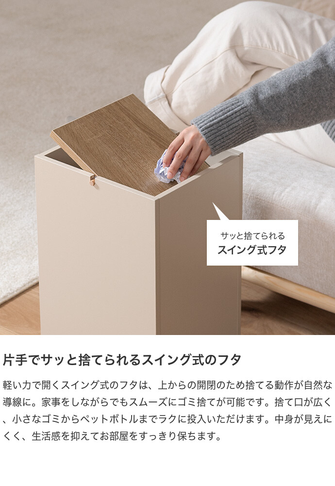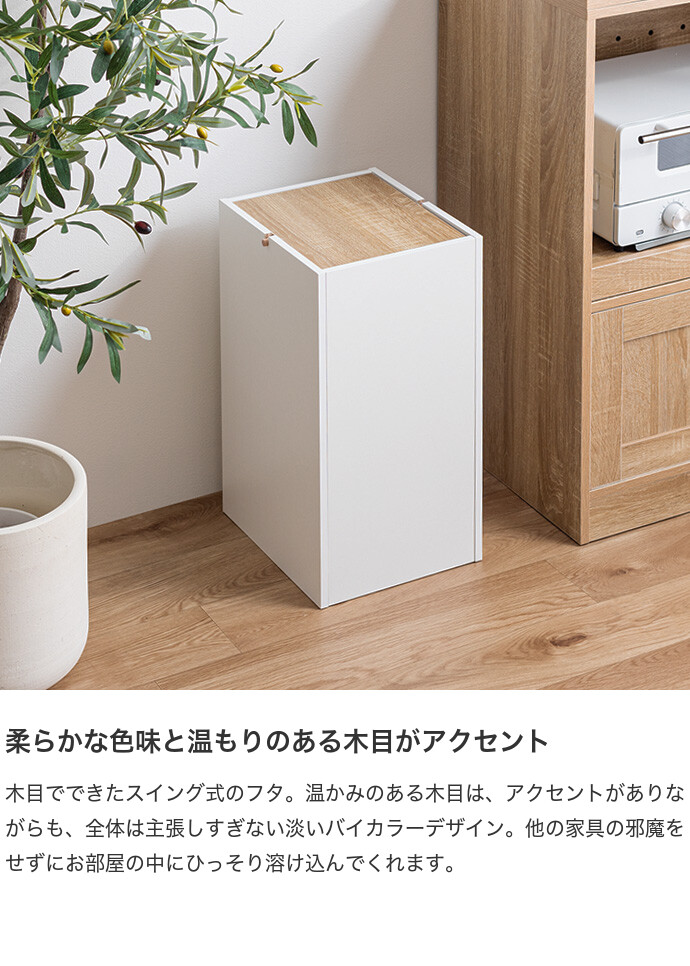 生活感を隠しインテリアに溶け込むゴミ箱。柔らかな色味と木目のバイカラーデザインは、ゴミ箱ながらもインテリアに溶け込みます。またスイング式のフタは、片手でスムーズにゴミ捨てができ使いやすさ抜群。容量もしっかりありながらコンパクトなサイズ感で、空間をすっきりさせてくれます。