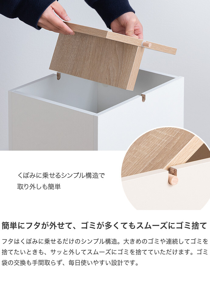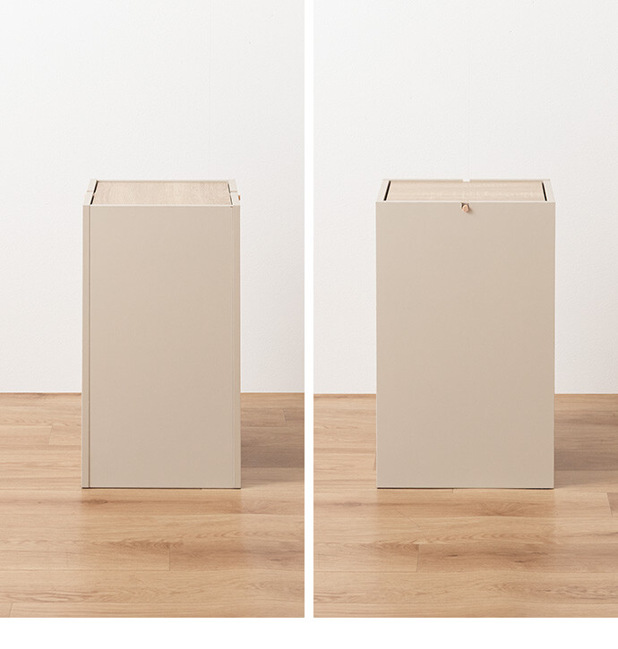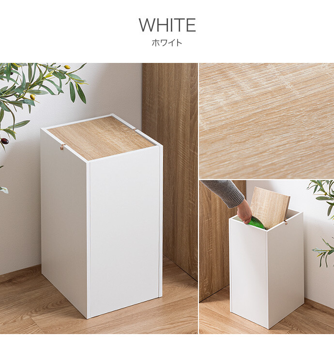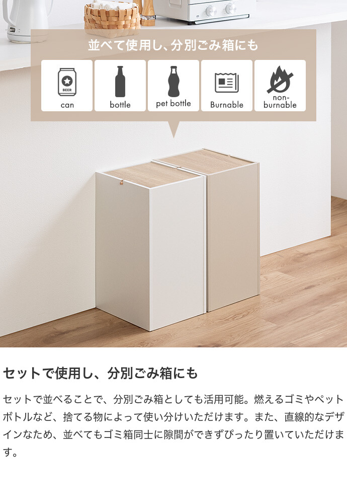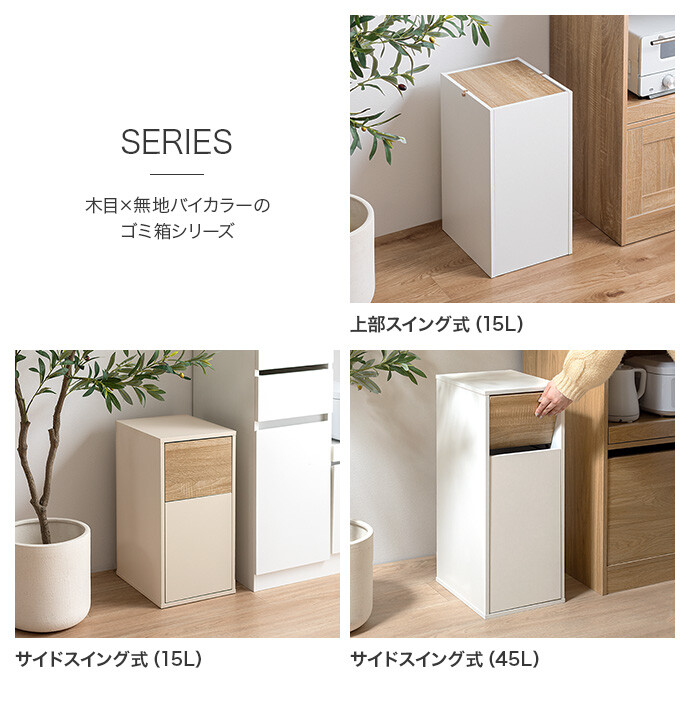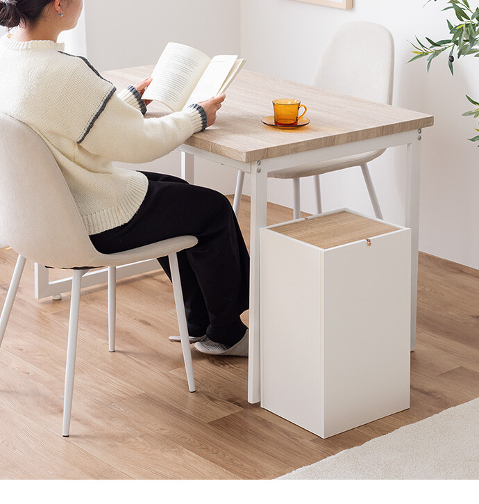 生活感を隠しインテリアに溶け込むゴミ箱。柔らかな色味と木目のバイカラーデザインは、ゴミ箱ながらもインテリアに溶け込みます。またスイング式のフタは、片手でスムーズにゴミ捨てができ使いやすさ抜群。容量もしっかりありながらコンパクトなサイズ感で、空間をすっきりさせてくれます。