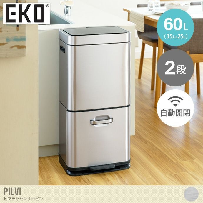 【送料無料】幅42 雑貨 キッチン ゴミ箱 ごみ箱 ダストボックス EKO 60L 60リットル 35L 25L 2段 分別 自動開閉 乾電池式 単三電池 センサー付き ペダル 非接触 インナーボックス フタ 蓋 大容量 角型 リビング ダイニング シルバー