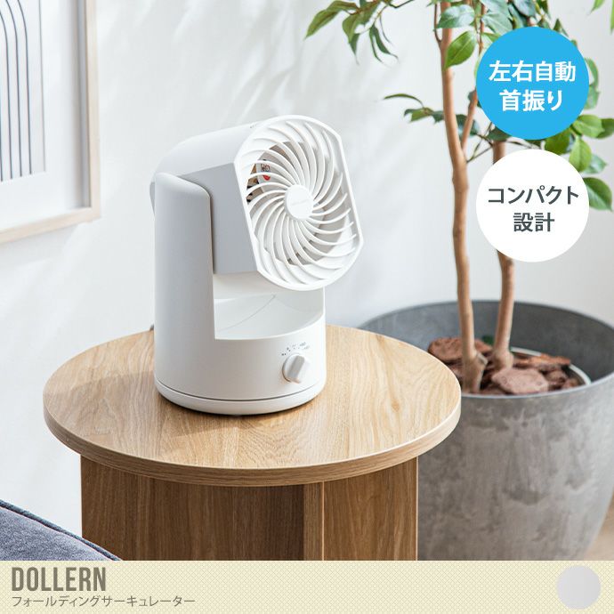 コンパクトに収納できるシンプルなフォールディングサーキュレーター『Dollern(ドレルン)』。ヘッド部分を回転させると本体に収まりコンパクトになります。シーズンオフ時の収納スペース確保に困らず、また持ち運びも楽々。 シンプルデザイン&省スペースなので使えるお部屋を選ばず設置することができます。