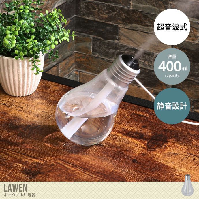 しゃれな電球デザインの加湿器『Lawen(ラウェン)』。特徴的なデザインながらインテリアに合わせやすく、置き場所に困らないコンパクトなボディ。また電源はUSBケーブルなので、場所を選ばす持ち運びが可能。7色のLEDライトがお部屋に癒やしをプラスします。