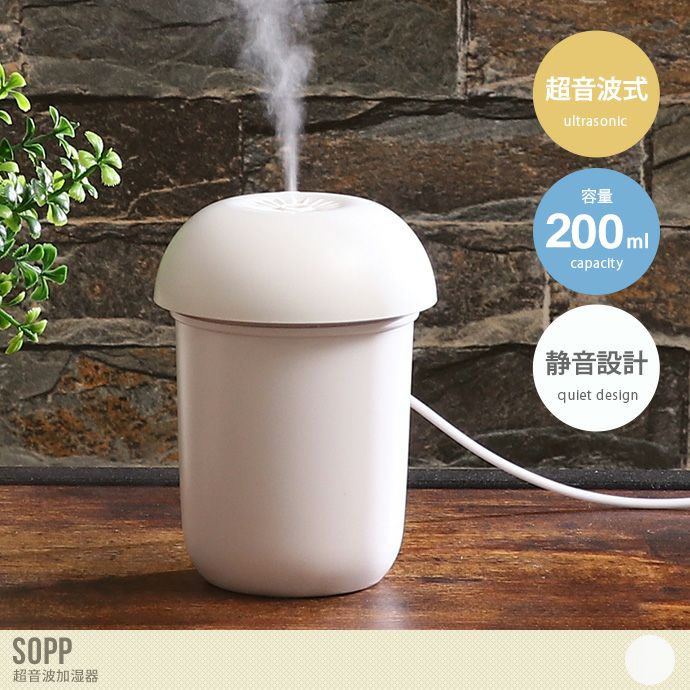 持ち運び自由な超音波加湿器『Sopp(ソップ)』。コンパクトなのに大容量で200mlの水が入ります。また、USB給電で簡単に作動するので、モバイルバッテリーやパソコンにつなぐことができ、どこへでも持ち運びが可能。空気が乾燥しやすいこの季節に、自分専用の加湿器はいかがでしょうか。