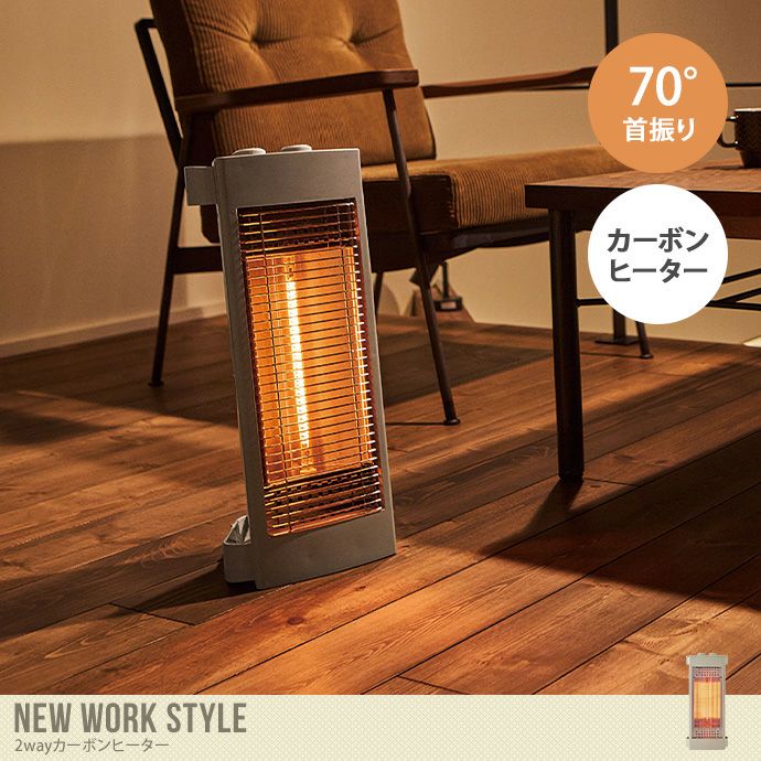 縦置きでも横置きでも使える『New work style(ニューワークスタイル)』シリーズの2wayカーボンヒーター。熱効率の高いカーボン管を採用し、速暖性に優れています。狭い空間では縦置きで、冷え込む足元をしっかり暖めたい時は横置きで。パーソナル使用におすすめのヒーターです。