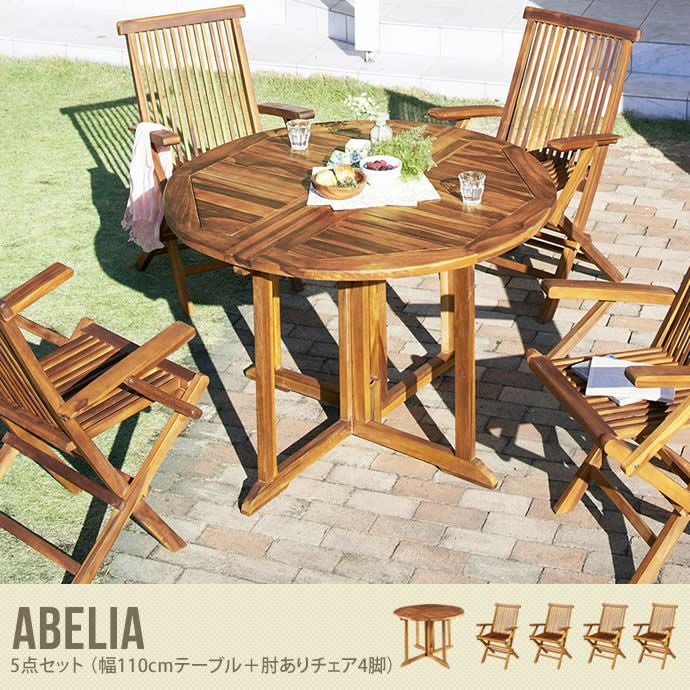 憧れのガーデンライフを♪ご自宅のお庭やテラスをよりステキな空間にしてくれるガーデンファニチャーのセットです。テーブルとチェアが一式揃う5点セットになっています。毎日の暮らしを外へ持ち出せば開放的な気分になり、食事や会話がもっと楽しくなりますよ!テーブルは場所を取らず、会話もはずみやすい円形タイプ。チェアも肘ありなので、ゆっくり話すにはぴったりの仕様です。テーブルもチェアも折りたたみ式なので持ち運びもラクラクです。材質は高級木材のチーク!使い続けるうちに深いシルバーグレーに変化していくので味わい深くなっていくのも魅力的です。オシャレなカフェのテラス席やホテルにも似合うデザインなので用途さまざまにお使いいただけるアイテムです。