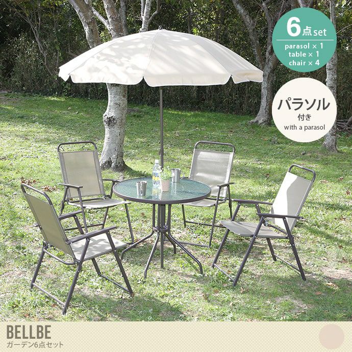 ガラステーブルと4脚のチェアにパラソルが付いたガーデン6点セット『Bellbe(ベルベ)』。シンプルなデザインなのでお庭やテラスに自然と馴染みます。付属のパラソルを使えば、ほどよく日差しをカットしてくれるので、屋外でもカフェタイムや読書タイムを楽しむことができます。