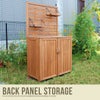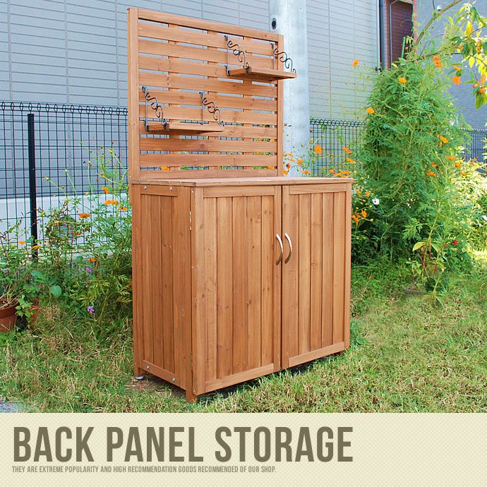 天板が作業台になり、バックパネルは間仕切りになる多機能の木製収納庫(物置)。小さなプランターが飾れる吊り棚が付いています。2サイズご用意しました。