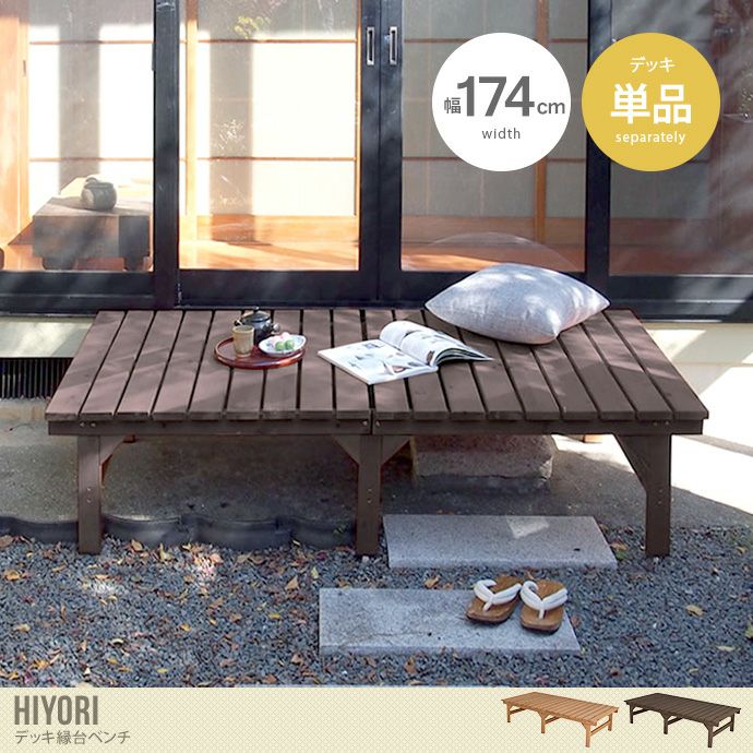 癒しのアウトドアリビング空間が作れる『Hiyori(ヒヨリ)』のデッキ縁台。美しい天然木とシンプルなデザインのデッキ縁台は、まるで室内の延長のような空間を実現。外の気持ちいい風と太陽を感じながらゆったり過ごしたり、ティータイムを楽しんだりと、癒しの時間をお過ごしいただけます。また、ガーデン用品を置いたり、天日干しの台として使ったりなどと、実用的な使い方をして活用することも可能です。
