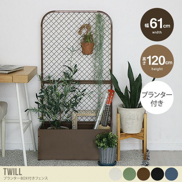 屋外・室内両用で使える『TWILL(ツイル)』プランターBOX付きフェンス。幅60.5cm×奥行25cmとスリムな作りなので、お部屋やベランダの限られたスペースに置くことができます。またプランターBOXが付いているので、屋外では植物の鉢入れや、ガーデン用品を収納することができ、室内ではオフィスやエントランスのパーションとして活用したり雑貨を飾って楽しんでいただくことが可能です。色味はどんなテイストにも合わせやすいニュアンスカラー仕上げ。他の色とも合わせやすいため、気軽にお使いいただけます。