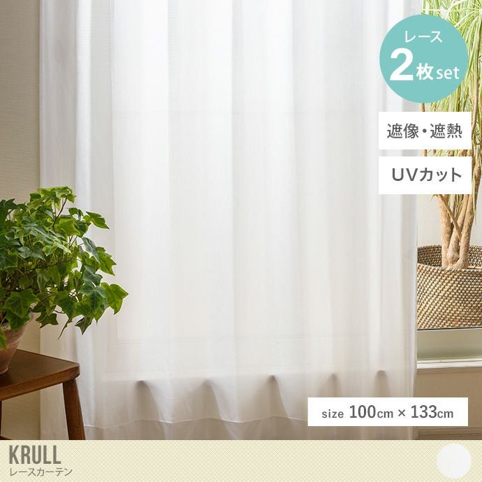 遮像・遮熱効果のある『Krull(クルル)』のレースカーテン。UVカットの効果もあるレースカーテンが2枚セットになっています。遮像性のレースカーテンなので、目隠し効果が高く部屋の中を外から見えにくい仕様。遮熱効果もあるので、エアコンの効きをよくしてくれるので、エコなだけでなく電気代節約にもなります。