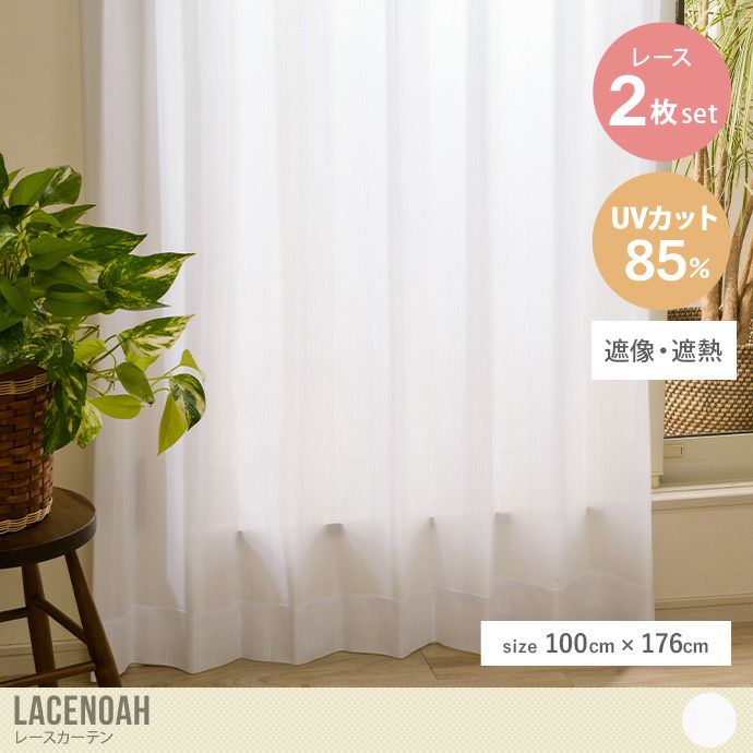 縦ストライプ柄があしらわれた『Lacenoah(レースノア)』のレースカーテン。UVカット85%もあるレースカーテンが2枚セットになっています。また、遮像性のレースカーテンなので、目隠し効果が高く部屋の中を外から見えにくい仕様。遮熱効果もあるので、エアコンの効きをよくしてくれるので、エコなだけでなく電気代節約にもなります。