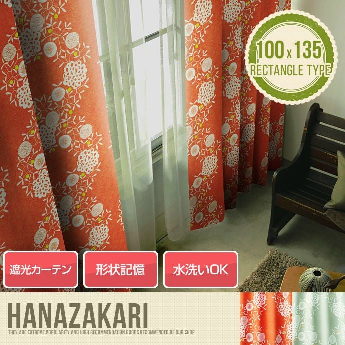 【100cm×135cm】 HANAKAZARI ハナカザリ 1.5倍ヒダ 遮光2級 レトロ 明るい フラワー 日本製 オレンジ