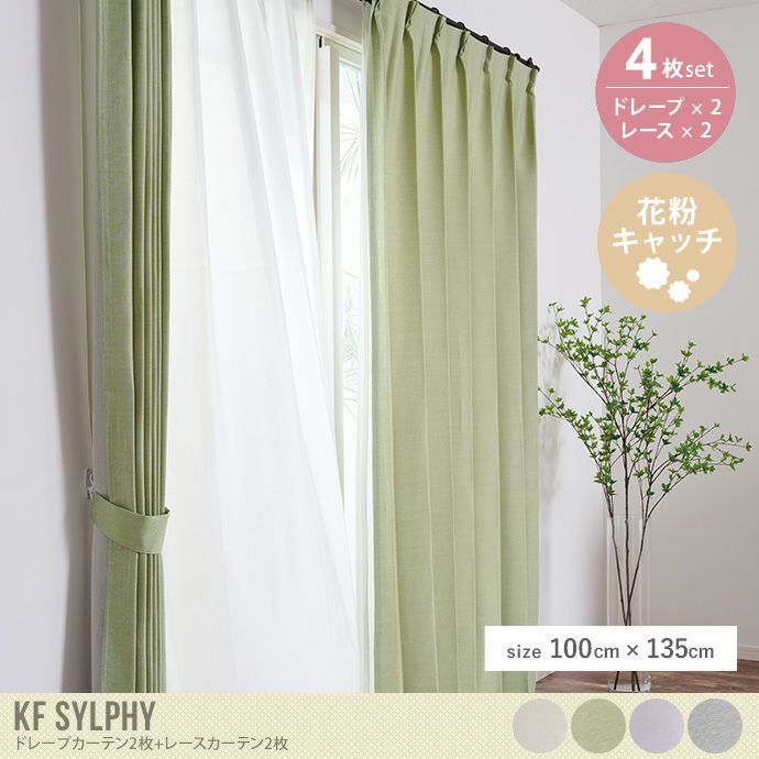 ドレープカーテンとレースカーテンが2枚ずつセットになった『KF sylphy(ケーエフシルフィ)』シリーズのカーテン。厚地のドレープカーテン2枚と、遮像・遮熱効果のあるレースカーテンが2枚セットになっているので、別々で用意する手間なくすぐにお使いいただけます。