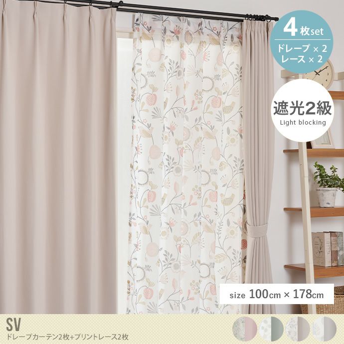 ドレープカーテンとプリントレースが2枚ずつセットになった『SV(エスブイ)』シリーズのカーテン。厚地のドレープカーテン2枚と、ナチュラルな柄がプリントされたレースカーテンが2枚セットになっているので、別々で用意する手間なくすぐにお使いいただけます。きれいにプリントされたシアー感のあるレースは、室内側に設置してフロントレースにすると、カーテンを閉じている間も、お部屋をパッと華やかにしてくれます。
