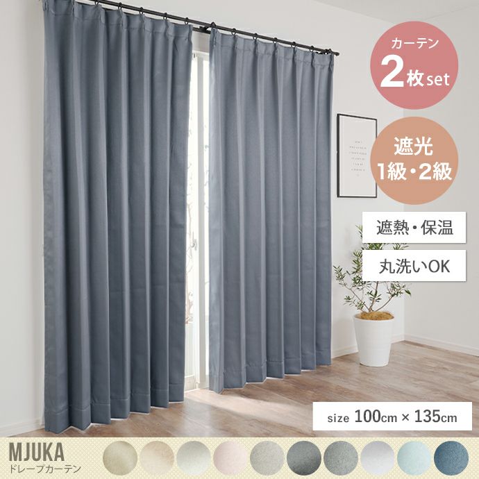 なめらかな光沢感と高級感ある柔らかい生地が特徴の『Mjuka(ミューカ)』ドレープカーテン。外からの光を遮り、日中でもお部屋を暗くしてくれる遮光機能付き。外からシルエットが映りにくいため、プライバシーが気になる方にもおすすめです。また洗濯をしても縮みにくいポリエステルを使用。洗濯機で丸洗いができ、いつでも清潔にお使いいただけます。さらにカラーは10色ご用意しました。お部屋の雰囲気に合った、お好みのカラーをお選びください。