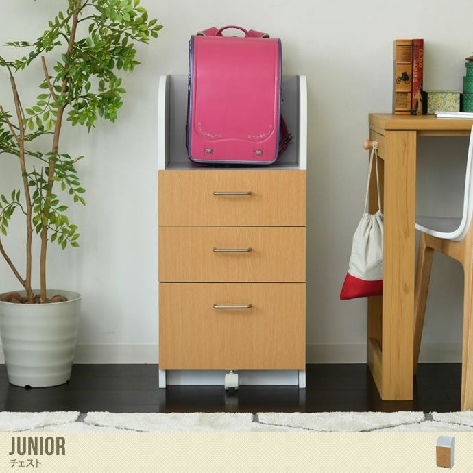 子供部屋やリビングに馴染むシンプルデザインの『Junior(ジュニア)』シリーズのチェストです。こちらのチェストにはランドセルが置きやすい天板と、3段の引き出しが付いています。上段・中段の浅い引き出しには小物や薄手の衣類、下段の深い引き出しには厚手の衣類やおもちゃを収められます。深さの違う引き出しを使い分けて整理整頓ができます。天板のオープンスペースは、ランドセルを置くのにピッタリな大きさとなっています。