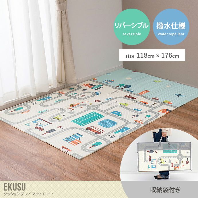 サッとひと拭きでお手入れが簡単な『Ekusu(エクス)』シリーズから118cm×176cmのクッションプレイマットロードが登場しました。フロアマットとしてだけでなく、子供の遊び場にもおすすめなクッションプレイマットです。使わない時は折りたたんで収納ができる優れもの。また、嬉しい収納袋付きでお泊り先などに持っていくこともできます。裏面は木目柄になっておりリバーシブルで使えるので、子供の成長にあわせて長く使っていただけます。