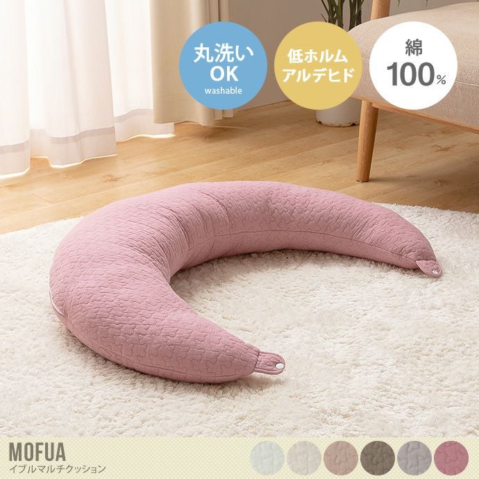 環境に配慮し中綿の一部にリサイクルコットンを使用したイブル生地で作られた肌触りがやさしい『Mofua(モフア)』シリーズのイブルマルチクッション。素材には綿100%を使用し、もこもこしたキルティング加工がされており、夏はさらりと冬はほんのり暖かくオールシーズンお使いいただけます。ホックがあるのでお座りクッションにしたり、ホックを外して授乳クッションや抱き枕など様々な用途にお使いいただけます。
