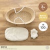 環境に配慮し中綿の一部にリサイクルコットンを使用したイブル生地で作られた肌触りがやさしい『Mofua(モフア)』シリーズのクーファン 抱っこふとん&べびーまくらの3点セット。赤ちゃんの移動に便利なクーファンは、天然のトウモロコシの皮を編込んで作られており縫製もしっかりとして頑丈な作りです。抱っこふとんとまくらは綿100%で低ホルムアルデヒドと乳幼児基準をクリアした安心の品質でオールシーズンお使いいただけます。
