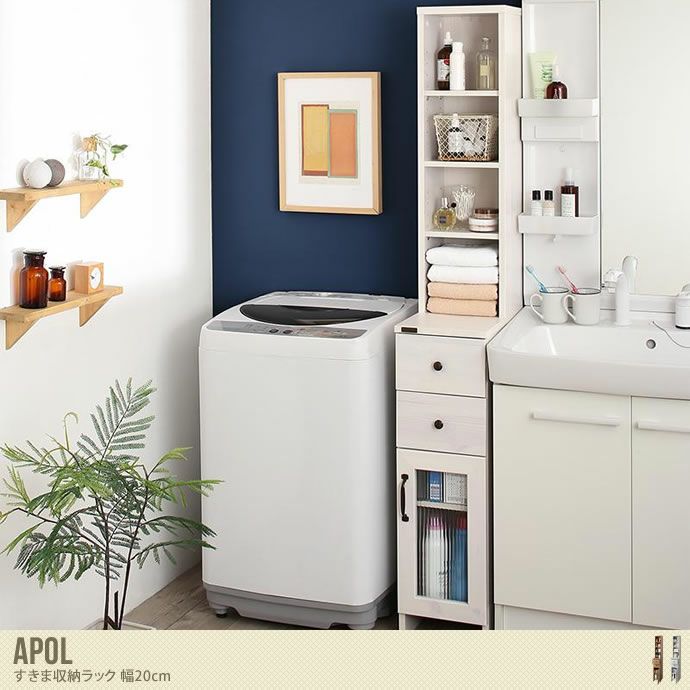 ちょっとしたスペースを有効活用することができる『Apol』すきま収納ラック(幅20cm)。冷蔵庫の横や洗面台の横などのすきまにスッポリ収まるスリムタイプの収納ラックです。オープン収納・引き出し収納・ガラス扉収納と3種類の収納スペースを設けているので、用途に合わせてお使いいただけます。デザインだけでなく機能性にも優れた収納ラックです。