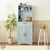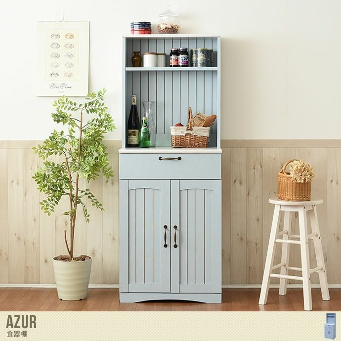 コンパクトサイズで一人暮らしの方でもお使いいただける“Azur(アジュール)”食器棚。オープン部の奥には2口コンセントが付いているので、オーブントースターなどの調理家電の収納に便利。上段には、可動棚があるので、調味料などの小物を収納できます。下段は、引き出しと扉収納で、カトラリーから食器類をしっかりと収納していただけます。丸みを帯びたフォルムとアンティーク調の取っ手といったディテールがカントリーテイストを漂わせます。