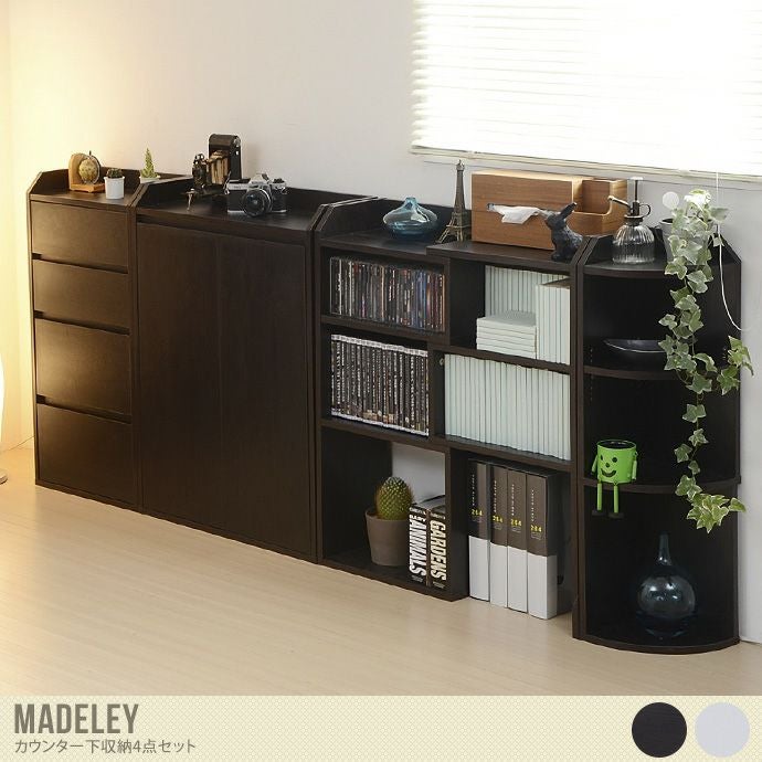カウンター下の空間を便利な収納に変える突っ張り金具付き『Madeley(マデリー)』シリーズのチェスト、キャビネット、伸縮ラック、コーナーラックの4点セットです。カウンター下だけではなくリビングでも使用でき、上部はオープンスペースで普段使いの小物置き場にもなります。