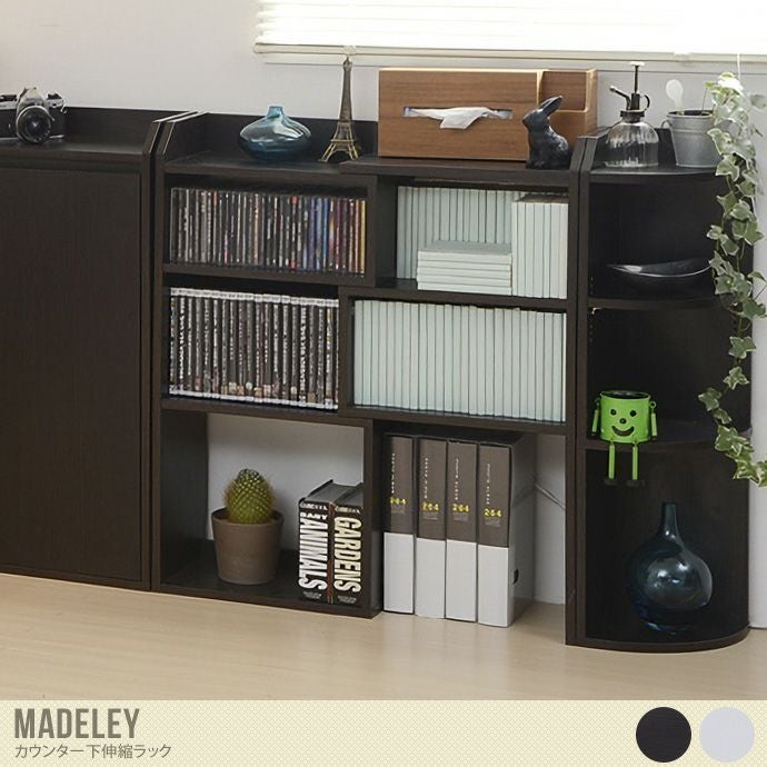 カウンター下の空間を便利な収納に変える突っ張り金具付き『Madeley(マデリー)』シリーズの横幅を調節できる伸縮ラックタイプです。カウンター下だけではなくリビングでも使用でき、上部はオープンスペースで普段使いの小物置き場にもなります。